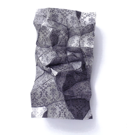 「wallpaper」では、壁紙を見る人が、壁紙に影響されて芽生える心境を題材にしている。そしてその心境が、こんどは逆に作品に封じ込められて、wallpaperの作品が出来上がっている。「KINTSUGI」は、心の傷が修復された記憶を表す作品である。はたして傷はそんなに簡単に癒やされるのだろうかとも思われるが、癒やされない傷をいつくしむ気持ちが、この作品をつくらせているのかもしれない。どちらの作品も、装身具としての機能をそなえている。