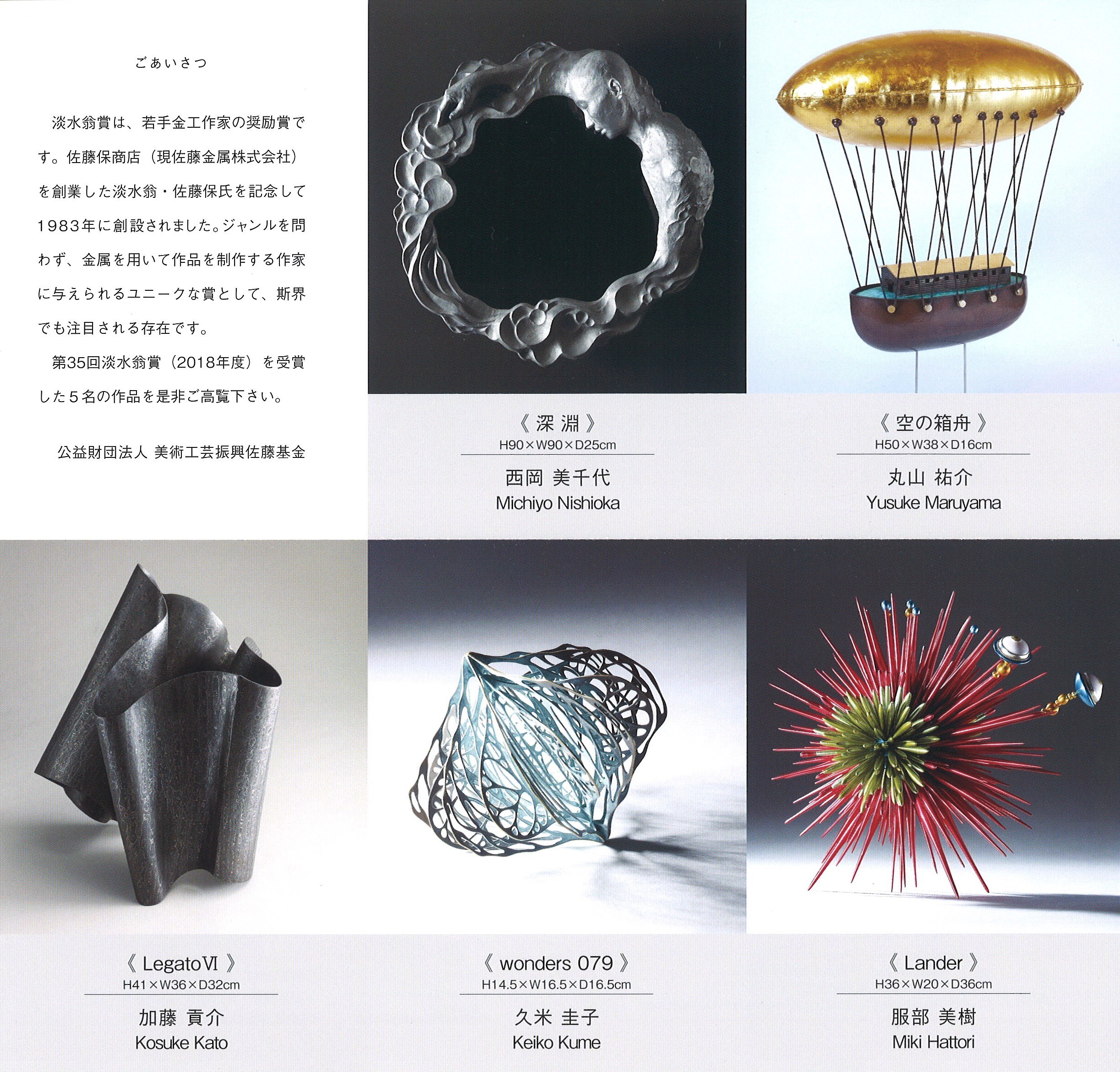 淡水翁賞は非鉄金属専業販売商社である佐藤保商店(現佐藤金属株式会社)を創業した淡水翁・佐藤保氏を記念して、若手の金工作家奨励のため、1983年に財団法人美術工芸振興佐藤基金が創設した賞です。