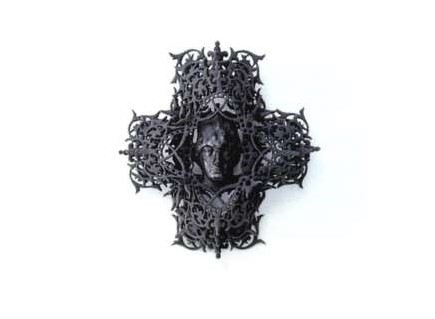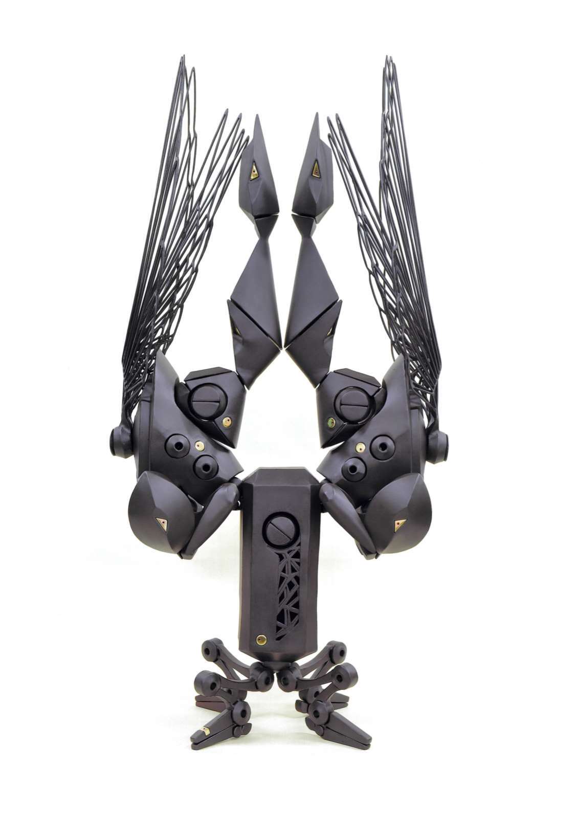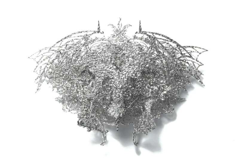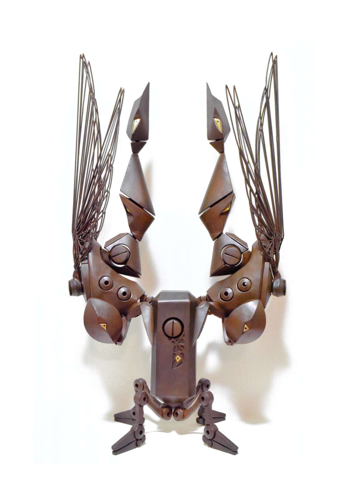 鉄の板材を鍛金技法によって造形し、薬品によって酸化させ鉄らしくない不思議な素材感を出しています。細部まで丁寧に仕上げられた作品には力強い生命感と、鉄という素材への愛が感じられます。