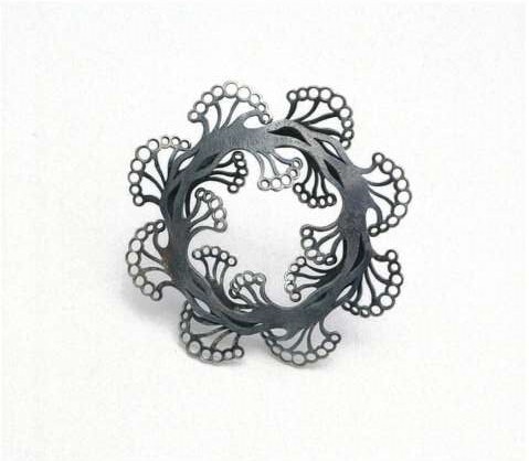 彫金技法である和彫りをもとにした独自の彫を開発し宝石の輝きを銀で作り出しています。銀の表面は無数のダイヤモンドをちりばめたように美しい作品です。また、銀の輝きを失くす技法も研究しており、意欲的な創作活動に今後も期待します。